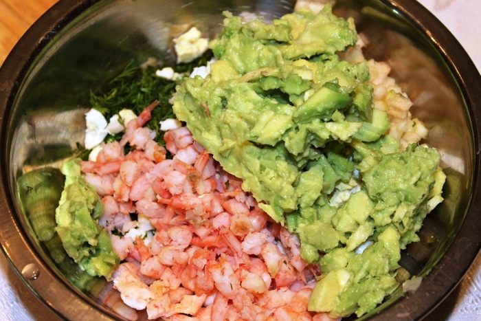 Добавить в начинку нарезанные креветки, яйца и мякоть авокадо. Не забудьте оставить 4 креветки и 2 яйца для украшения закуски.