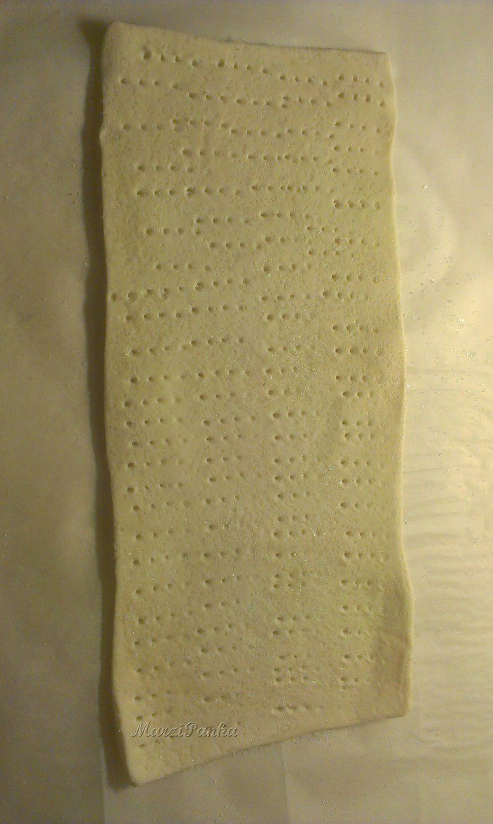 Приложите пласты теста друг к другу, обрежьте острым ножом излишки, чтобы пирожные были ровненькими. Намажьте половину пластов кремом, разровняйте силиконовой лопаточкой поверхность и накройте второй половиной. Отправьте в холодильник на несколько часов или на ночь.