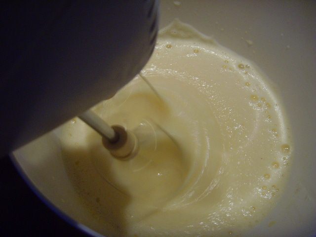 Желтки смешать с сахаром и молоком и при постоянном взбивании довести на водяной бане до загустения массы, снять с бани,