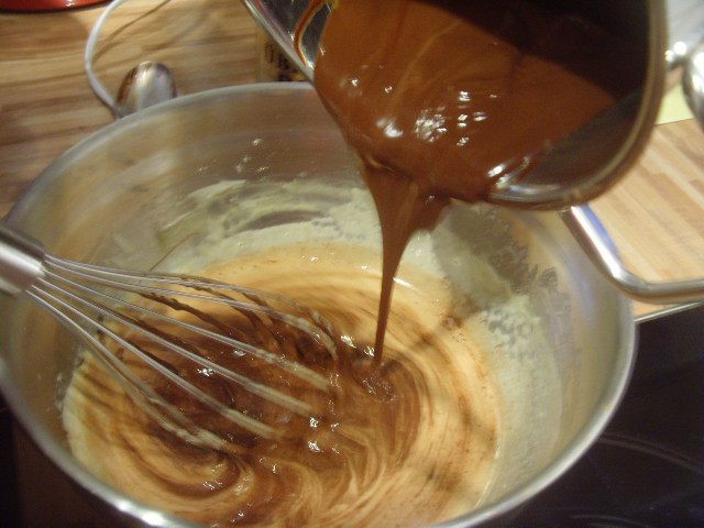 По частям (в 3 захода) ввести сливки в яично - шоколадную массу.