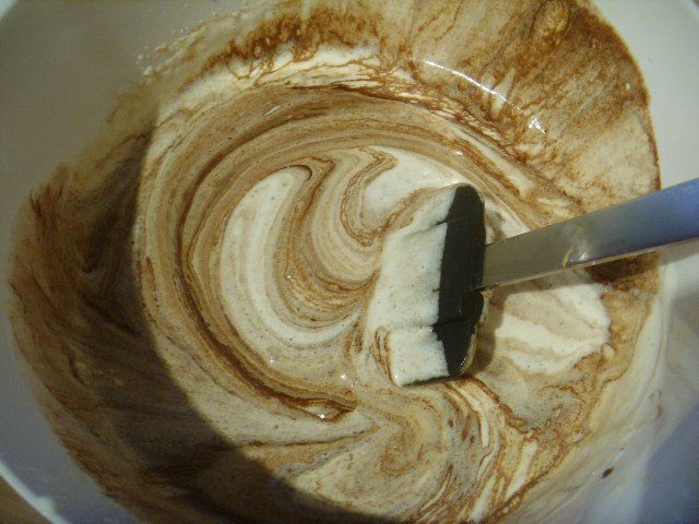 Довавить брауни в крем, аккуратно перемешивая его движениями лопаточки снизу вверх с кусочками теста.