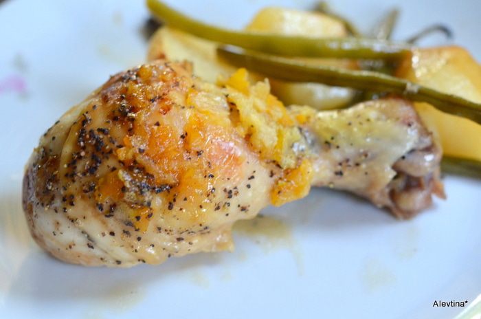 Куриные части все смазать сверху апельсиновым джемом 1/2 стакана. Сложить зеленую фасоль 200 г, предварительно кончики отрезать, картофель очищенный и порезанный на части, луковица порубленная на крупные части и куриные части в кулинарный пакет. Закрыть пакет и проколоть в 4-х частях на поверхности пакета. Поставить в разогретую духовку на 1 час.