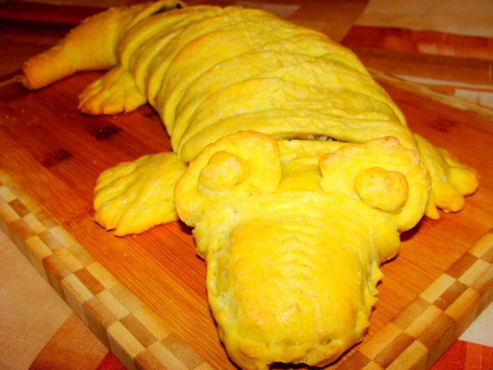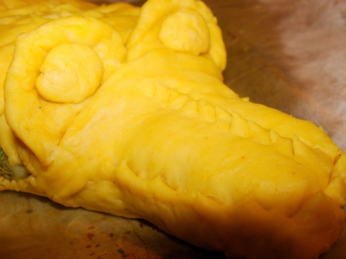 Дрожжи развести в теплой воде с сахаром, дать настояться в теплом месте. Влить в поднявшиеся дрожжи масло растительное, всыпать муку, картофельный крахмал, 0.5 ч/л куркумы, щепотку соли. Замесить очень плотное тесто. Вымесить нужно очень тщательно. Поставить в теплое место, накрыв пленкой или крышкой. Когда тесто увеличится вдвое, обмять его и дать подняться еще раз.
