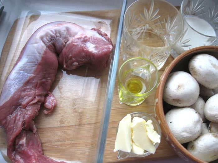 Вырезка требует деликатного обращения. Тогда она получается сочная, ароматная, тающая во рту, одним словом, отличная. Все это можно отнести к варианту, с которым я вас познакомлю. Несколько простых правил: перед приготовлением вырезку не мыть, перед жаркой она должна быть сухой и комнатной температуры, сковорода - с толстым дном. Определить, достаточно ли прогрелась сковорода можно, капнув каплю воды. Если сковорода нагрелась до нужной температуры, вода моментально испарится. Можно, как вариант, налить на сковороду растительное масло: оно должно начать совсем немного дымить. Не солить в процессе готовки. Посолите соус при приготовлении, поставьте соль на стол. Есть несколько методик – повышения и понижения температуры при запекании. Я воспользовалась более стандартной – небольшого понижения температуры. При высокой температуре происходит процесс карамелизации сахаров, содержащихся в мясе. Время нахождения в духовке зависит и от вида мяса, и от его веса, от заданной вами температуры, от способа подготовки мяса к этому процессу. И еще момент – не советую к грибам добавлять обжаренный лук, который как-то незаметно, но верно снижает тонкий аромат шампиньонов.