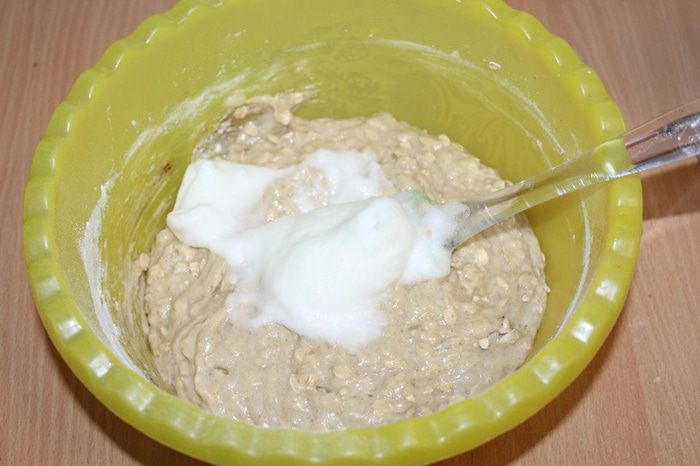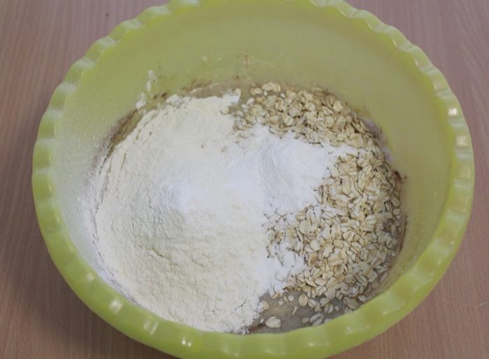 Всыпать овсяные хлопья ТМ «Националь», муку и разрыхлитель, перемешать.