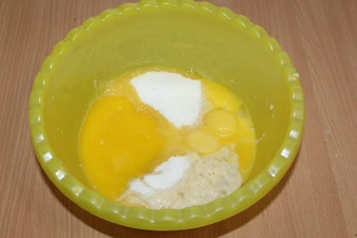 Смешать банановое пюре (банан размять вилкой), растопленное сливочное масло, яичные желтки, сахар. Все взбить, добавить корицу.