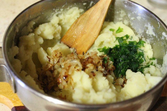 Сваренный картофель, размять толкушкой, при необходимости добавить молоко (если картофель сильно рассыпчатый). В картофель добавить обжаренный лук, щепотку мелко порезанного тимьяна, петрушки с укропом и перца.