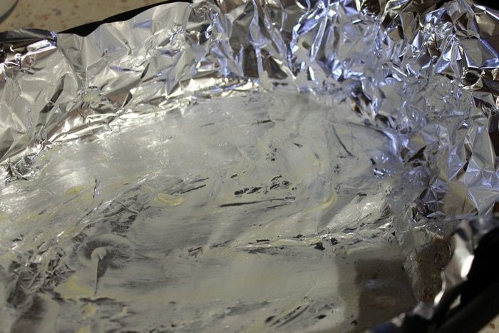 Форму застилаем фольгой и смазываем сливочным маслом.