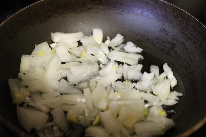 Пока картофель варится, обжарить лук мелкими кубиками на растительном масле, до золотистого цвета.
