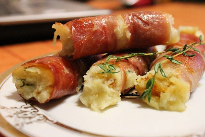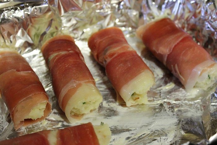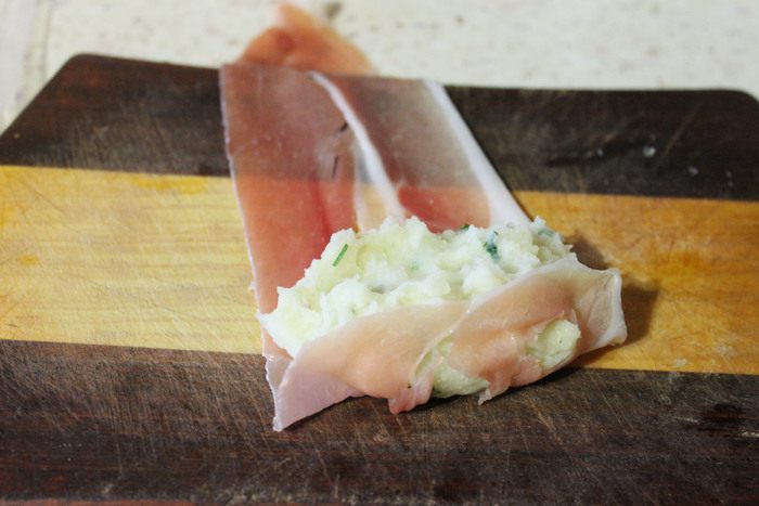 На край ломтика хамона, кладем столовую ложку пюре и аккуратно сворачиваем рулетиком.