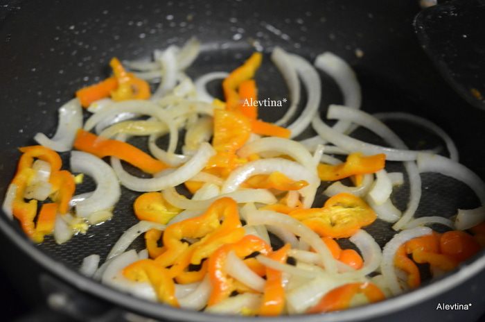 Обжарить на масле нарезанный лук и порезанный сладкий перец соломкой слегка. Снять с огня.