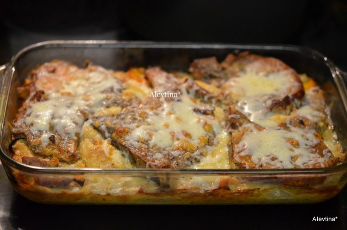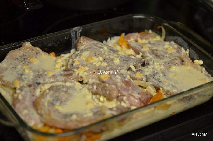 Затем выложить лук с перцем и свиные котлеты. Полить сверху смесью для оладий. Поставить в разогретую духовку на 200гр. на 40 мин.