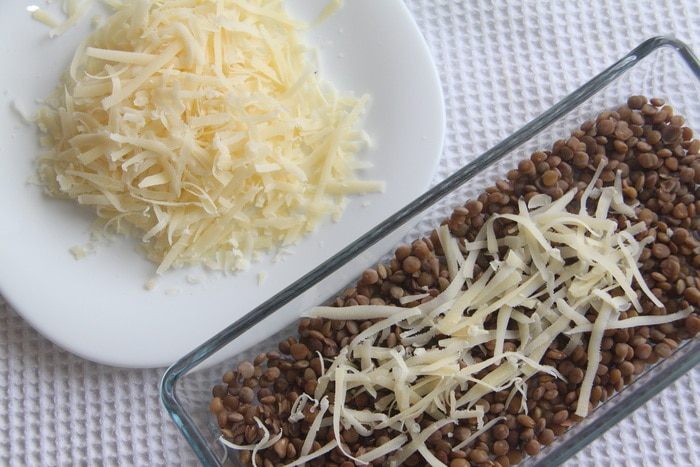 Натереть на крупной терке 50 г твердого сыра. Выложить на чечевицу.
