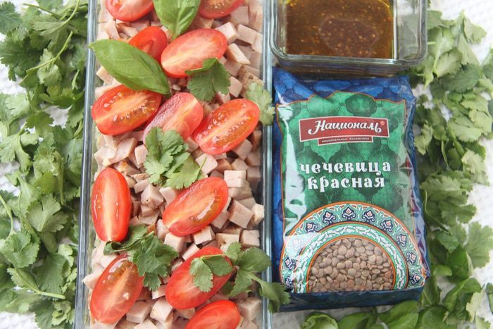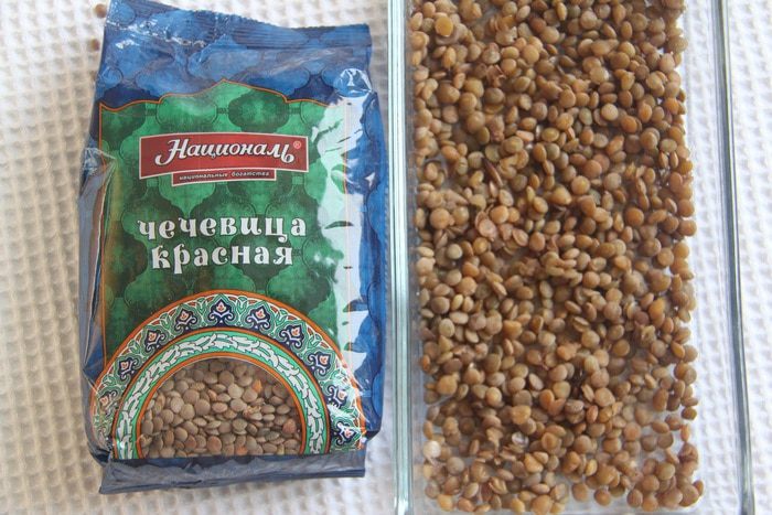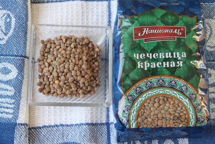 Для салата понадобится чечевица. Я использовала красную чечевицу ТМ «Националь» (40 г).