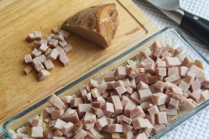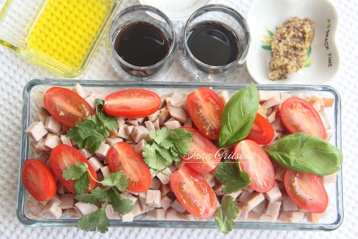 Небольшим кубиком нарезать 250–300 г буженины. Добавить в салат.