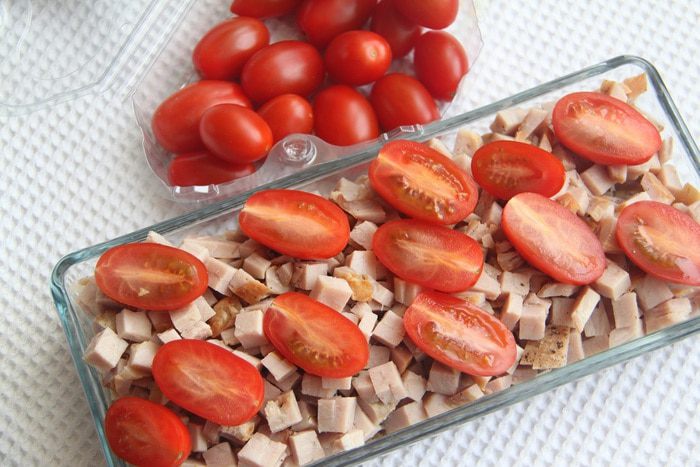 Помидоры черри разрезать на половинки и добавить в салат.