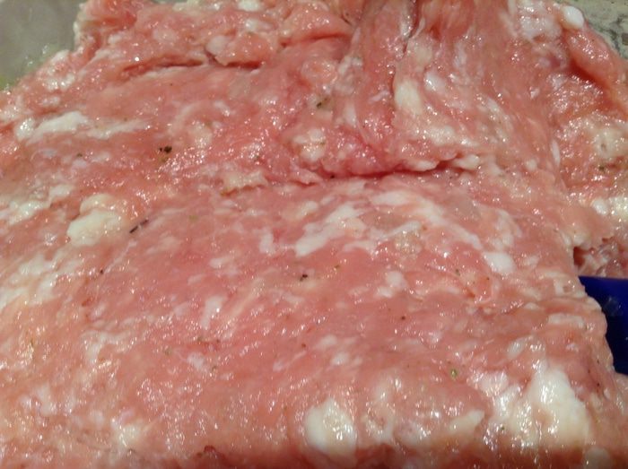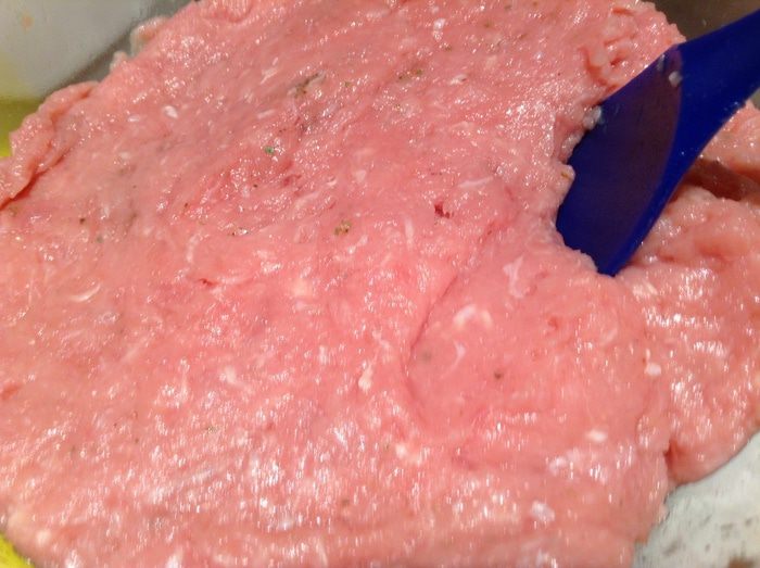 Мясо пропустить через мясорубку. При помощи блендера измельчить мясо, постепенно добавляя соль, перец и лед!Перемешать в однородную массу.