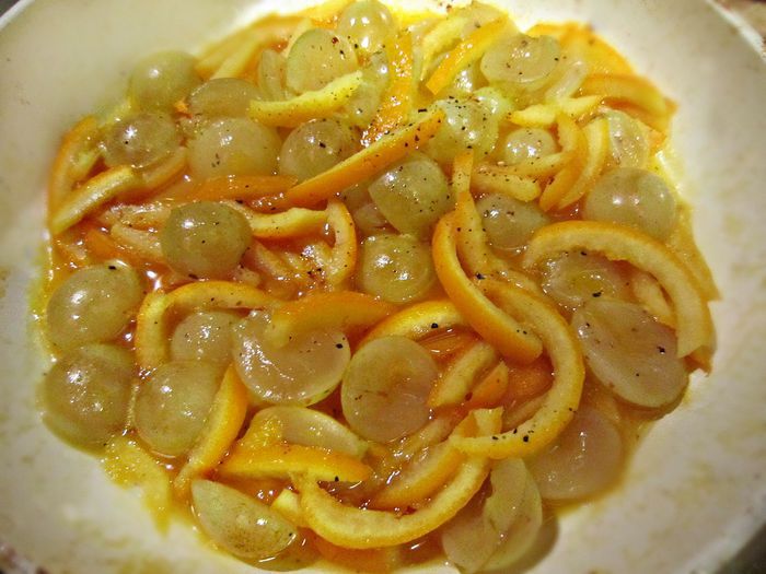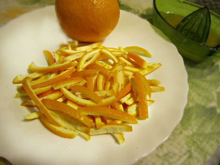 Апельсин вымыть, срезать острым ножом цедру и нашинковать её тонкой соломкой, прпустить в небольшом количестве воды 2-3 мин. Из мякоти выжать сок.