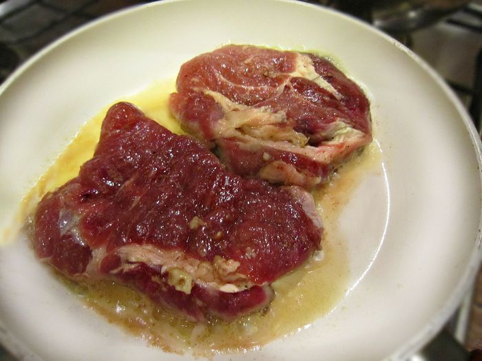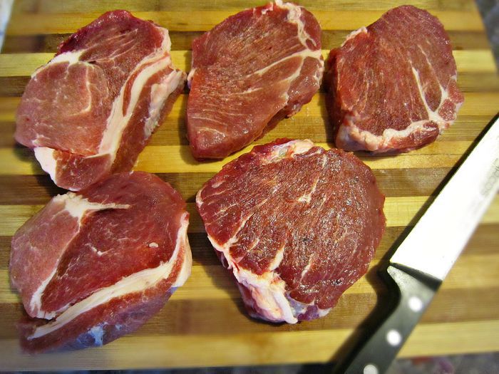 Филе свинины (я использовала шейку) нарезать ломтиками весом по 150-200 г Промыть, обсушить.