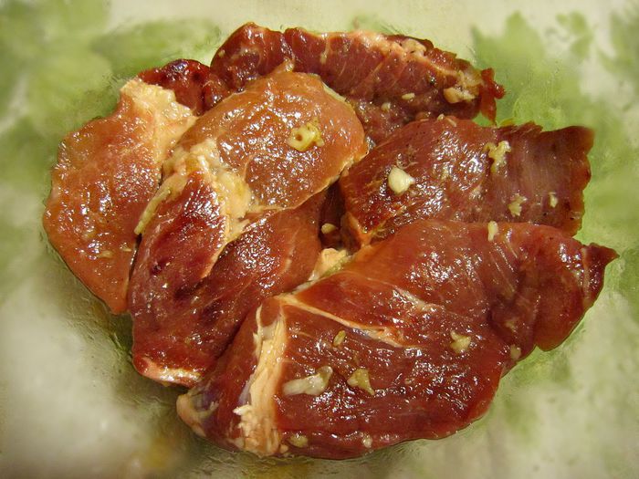 Ломтики мяса посолить, натереть приготовленной пастой и оставить мариноваться в холодильнике 30 мин.
