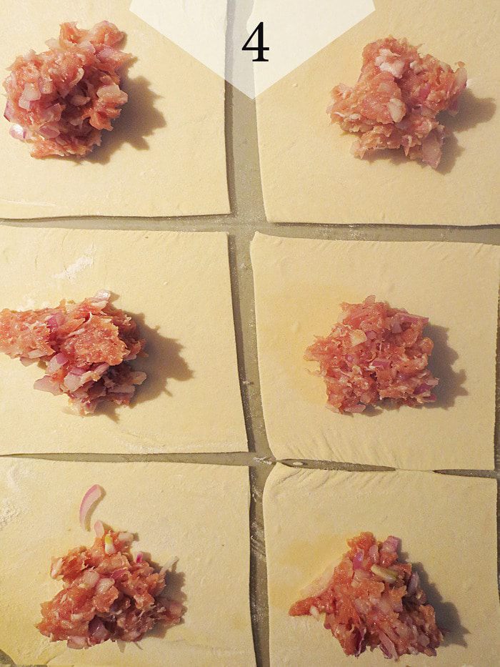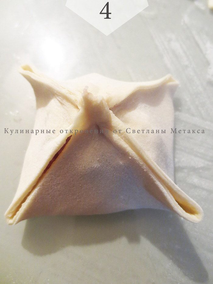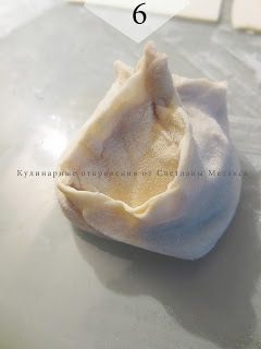 Раскатываем тесто. Лучше тесто разделить на три части, легче будет раскатывать. Тесто нужно раскатывать тонко. Раскатанное тесто разрезать на квадратики, примерно 12-15 см каждая сторона.