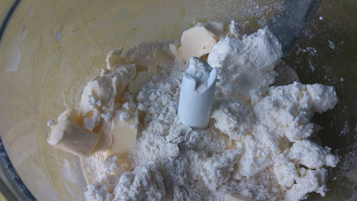 К просеянной муке добавить соль, творог и порезанное сливочное масло.