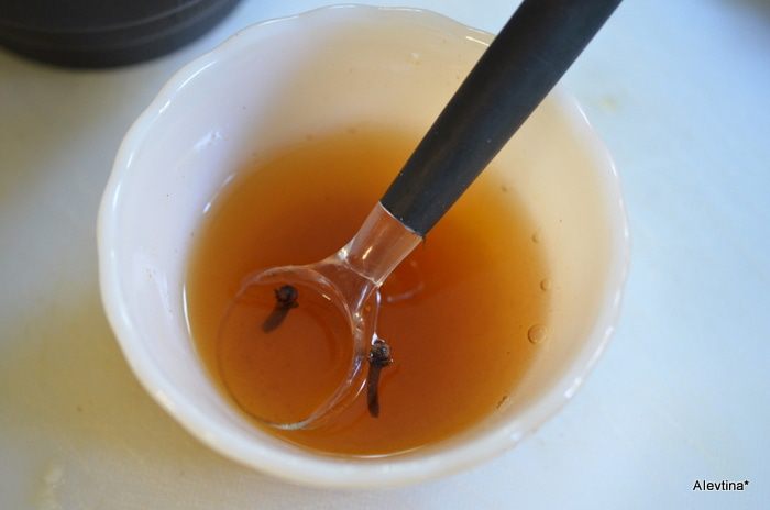 Смешать отдельно в емкости коньяк или бренди, воду, жидкий мед, гвоздику и палочку корицы или молотая корица порошком.