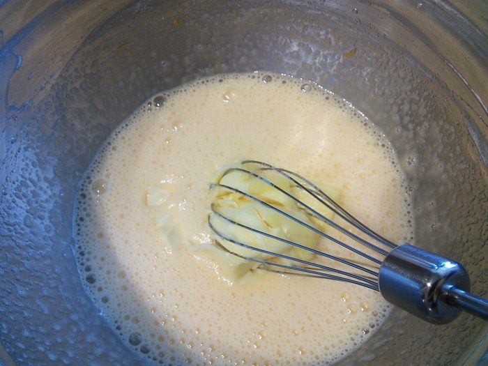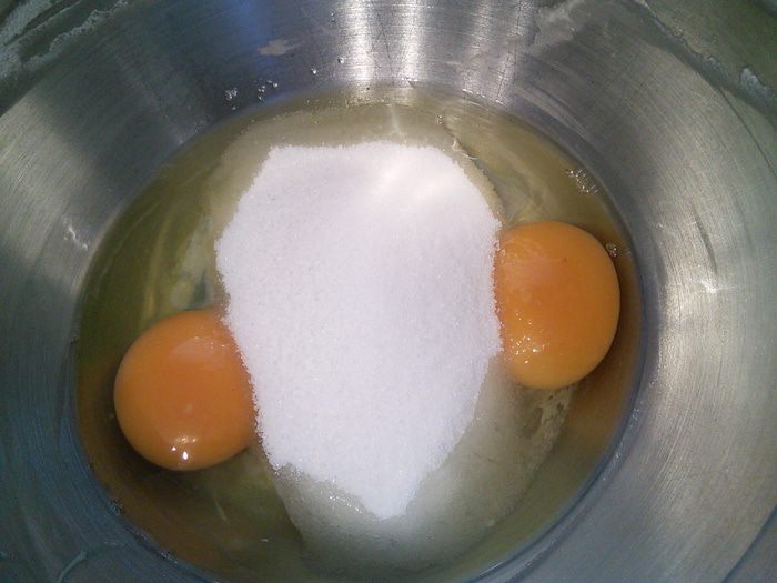 В другой миске взбить яйца комнатной температуры с сахаром до посветления и увеличения в объеме.