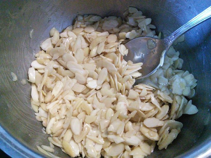 За это время сахар должен полностью раствориться, выложить в него миндальные лепестки, перемешать и снять с огня.