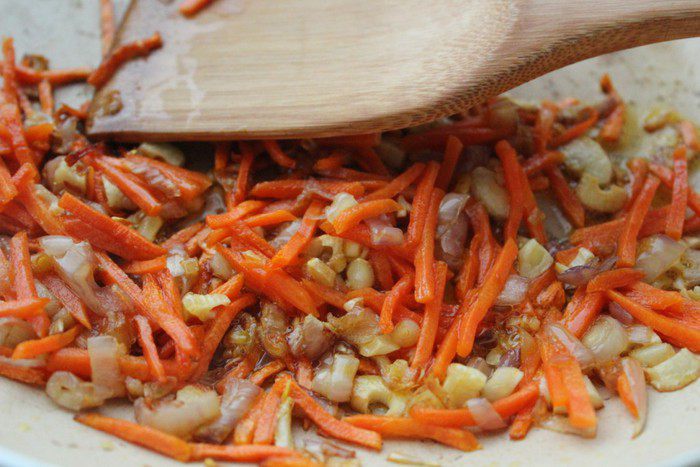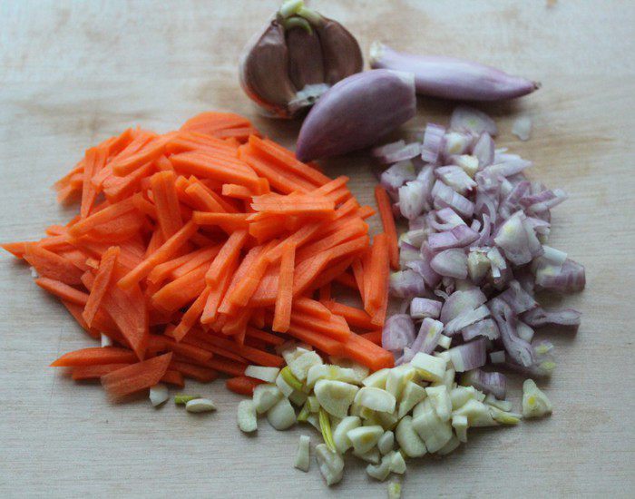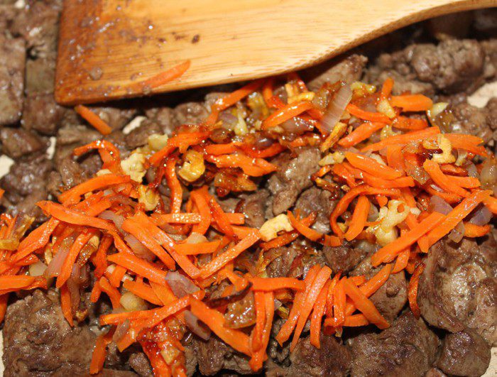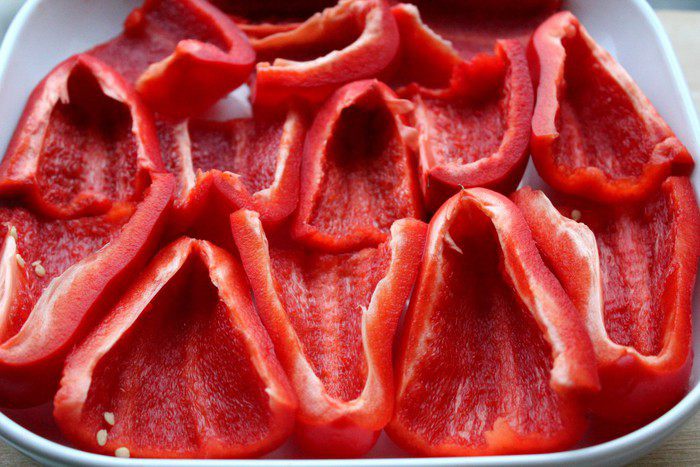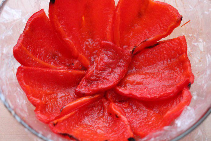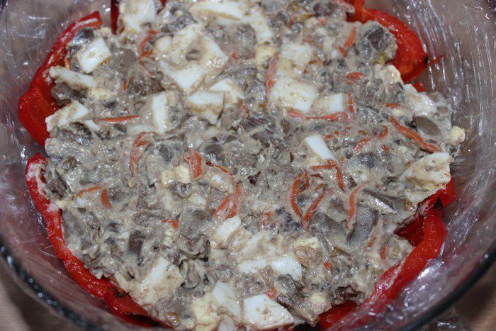 Слегка утрамбовать салат, накрыть оставшимся перцем. Завернуть края пленки к центру, накрыть тарелкой и поставить од гнет. Убрать террин в холодильник на ночь. На следующий день развернуть концы пленки, слить выделившийся сок. Перевернуть террин на блюдо, снять пленку.
