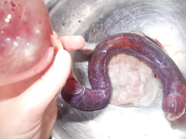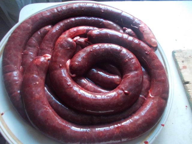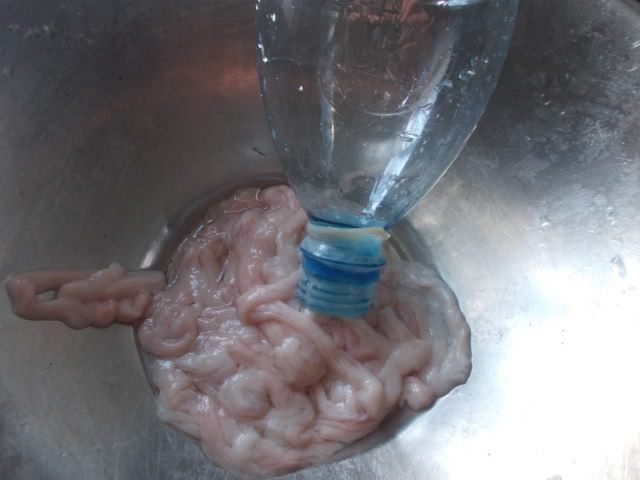 Почистить кишки (около 3 метров), для этого нужно, предварительно замочить в подсоленной воде на ночь, затем с помощью ножа вычистить. Хорошо помыть и с помощью воды в кране, проверить целостность кишок, чтобы не было дырочек. Второй вариант, это заказать набор в интернете. Наполнять кишки лучше через обрезанную бутылку.