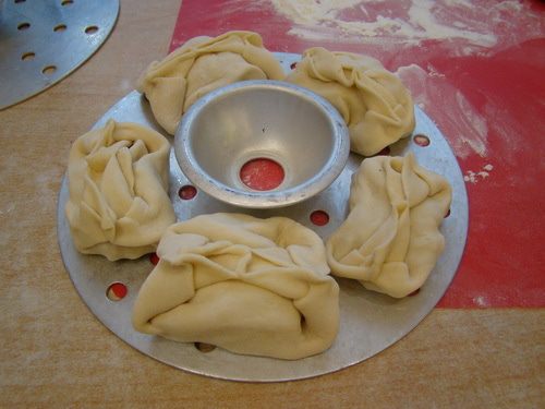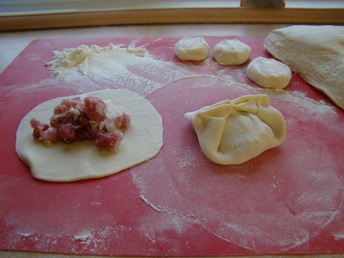 Замешиваем тугое тесто, если получилось не очень тугое, то в следующий раз в рецептуру не добавлять растительное масло, и тесто будет более податливое, лепешки более тонкими. Раскатываем тонкие лепешки, закладываем фарш, формируем манты.
