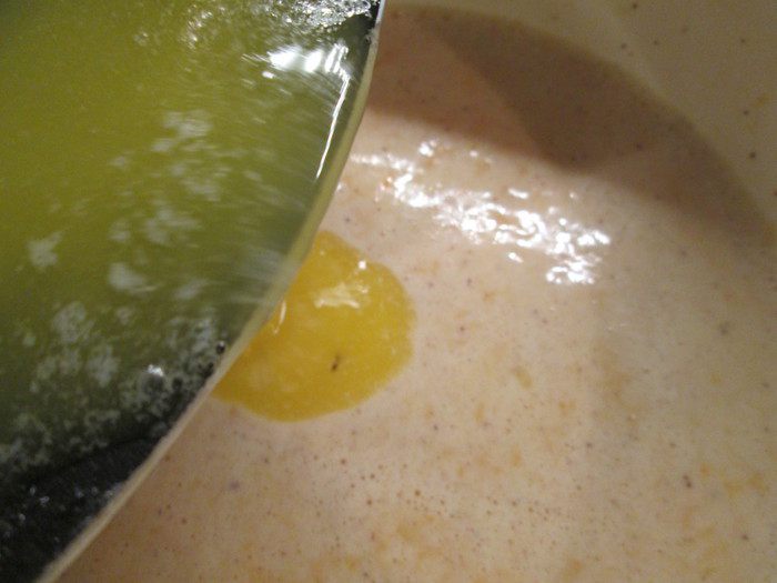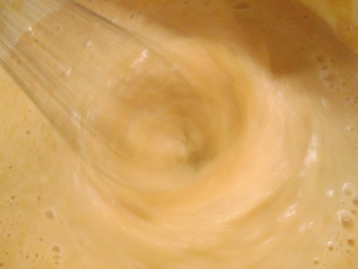 Добавляем еще часть молока, продолжая взбивать.