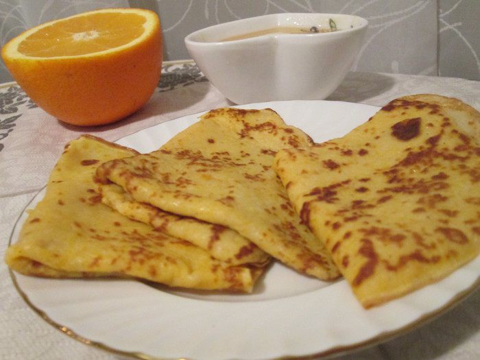 На сегодняшний день — это мои самые любимые блинчики и надеюсь, они понравятся и вам. Такие ароматные и вкусные, что никакая начинка им не нужна, и даже сладкие соусы, настолько вкус у этих блинчиков сбалансирован. Совсем не хочется никаких дополнений, разве что немного медку и то с неярко выраженным вкусом. Ради эксперимента сегодня я ела их в прикуску с апельсином, понравилось усиление апельсинового вкуса. А молоко для них лучшее — ТМ «Домик в деревне».