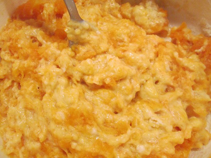 Готовить тыквенное пюре можно любым способом: из тушенных ломтиков тыквы, из запеченной или приготовленной на пару. Измельчать можно блендером, а я просто размяла вилочкой.