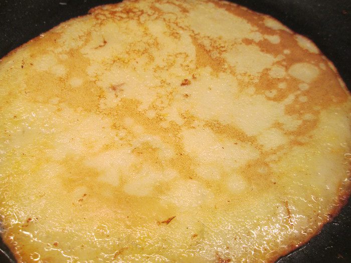 А вот и первый ароматный блин! Жарим до появления румяного края и переворачиваем на другу сторону, жарим еще минуту.