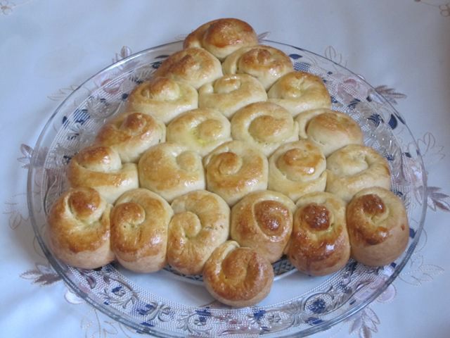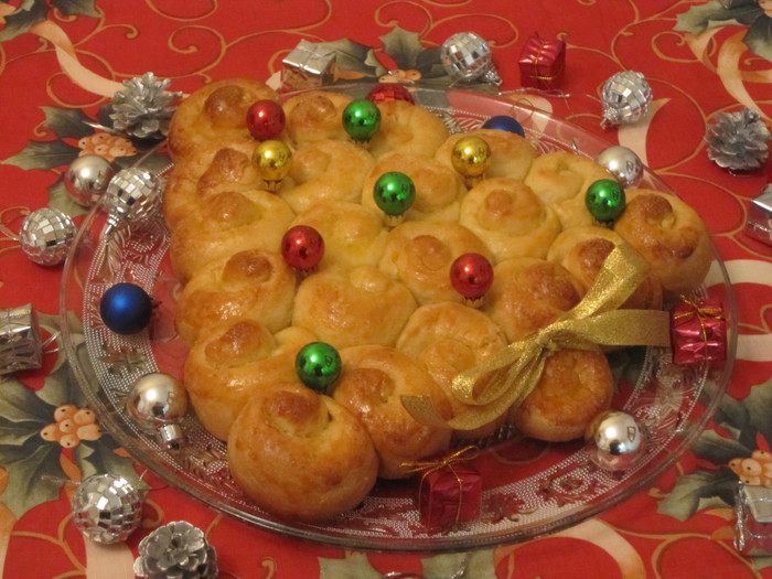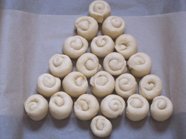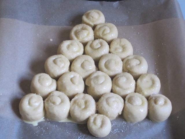Выложить на противень, выстланный бумагой для выпечки, на небольшом расстоянии друг от друга в виде треугольника - "ёлочки".