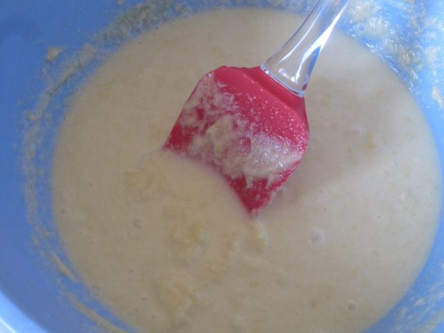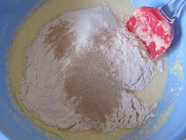 Постепенно всыпать муку, смешанную с сухими дрожжами.