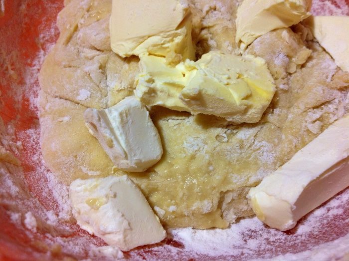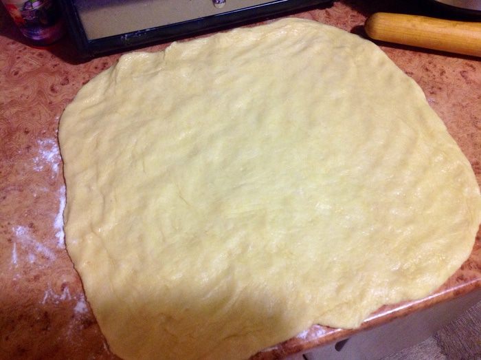 Продолжаем. Тесто положить на посыпанную мукой рабочую поверхность и сформировать руками прямоугольник.
