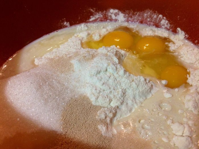 В миске смешать муку, сахар, дрожжи, теплое молоко и яйца. При помощи миксера,или руками. Тесто должно быть густым и мягким. Не крутым!!!!