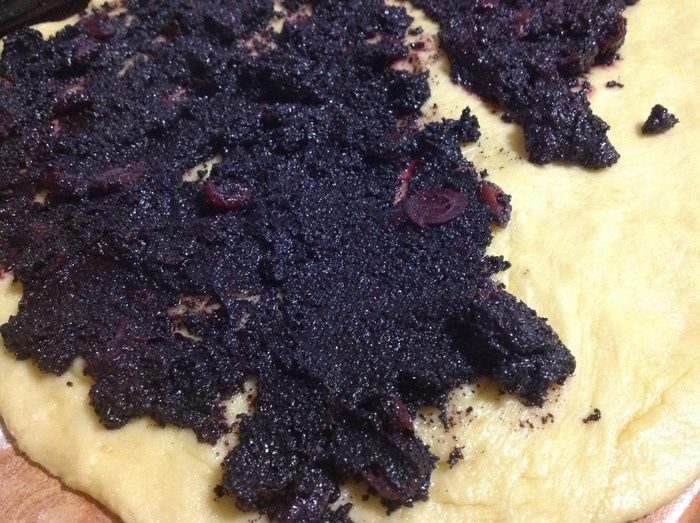 На пласт теста равномерно нанести начинку из мака и свернуть в виде рулета.
