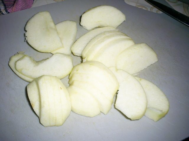Яблоки (у меня Симиренко) моем, очищаем кожуру, разрезаем на половинки, удаляем сердцевину. Нарезаем пластинками толщиной 3-4мм. Честно говоря, яблок у меня пошло гораздо больше, ибо у меня их на разных стадиях обработки таскала доця, ела сама и папу угощала)))