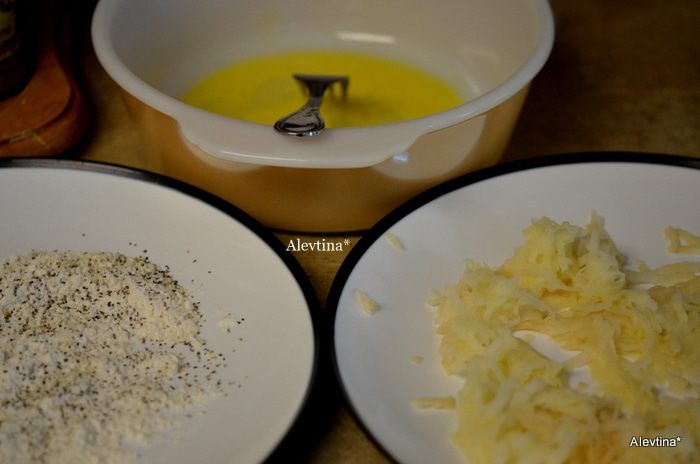 Приготовим 3 блюда: с мукой, черным перцем и солью перемешаем, второе -взбитое слегка яйцо, на третьем блюде - натертый на крупной терке картофель.