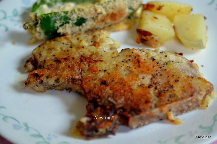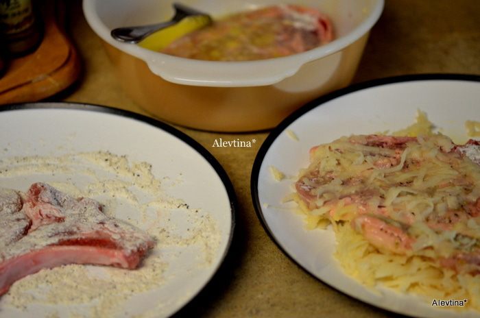 На свиных отбивных срежем лишний жир. Обваляем сначала в муке, затем в яйце, затем в картофеле, слегка прижимаем.