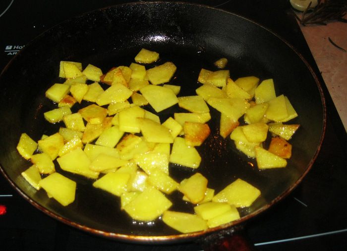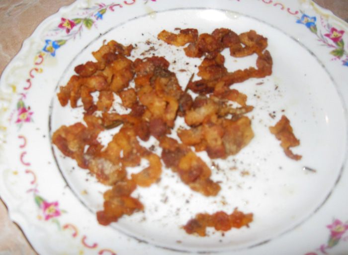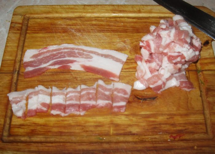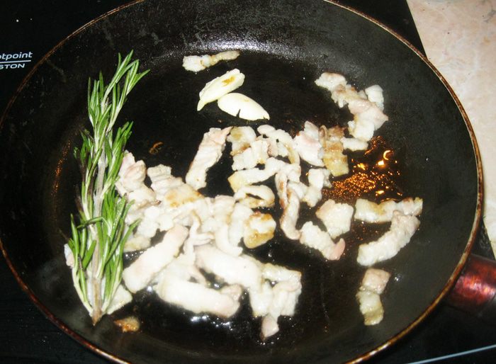 Бекон жарится быстро. Чем дольше он лежит на горячей сковородке, тем больше сала вытапливается и хрустнее становится бекон. Если хотите помягче, достаточно минуты после того, как сковородка нагреется. Но тогда, для жарки картошки, придется добавить столовую ложку растительного масла. Я жарил три минуты. Сала вытопилось много. Смешавшись с чесноком и розмарином, оно стало наполнять кухню возбуждающим аппетит духом.