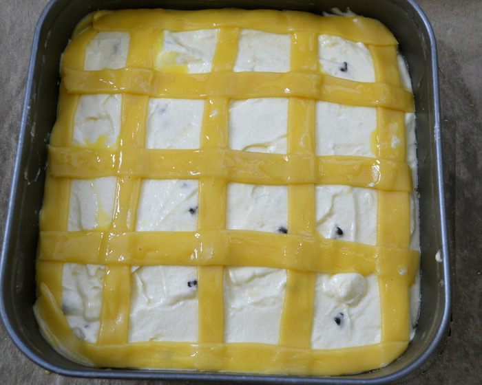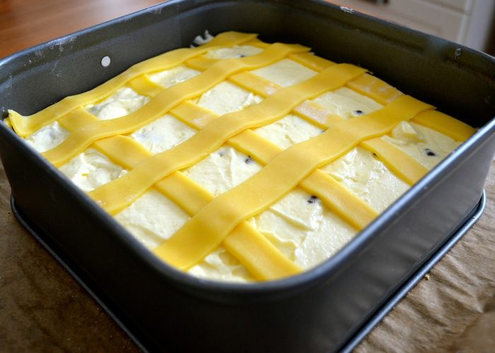 Оставшееся тесто раскатать в тонкий пласт и нарезать полоски шириной в 1 см. Выложить полоски теста поверх начинки решеткой.