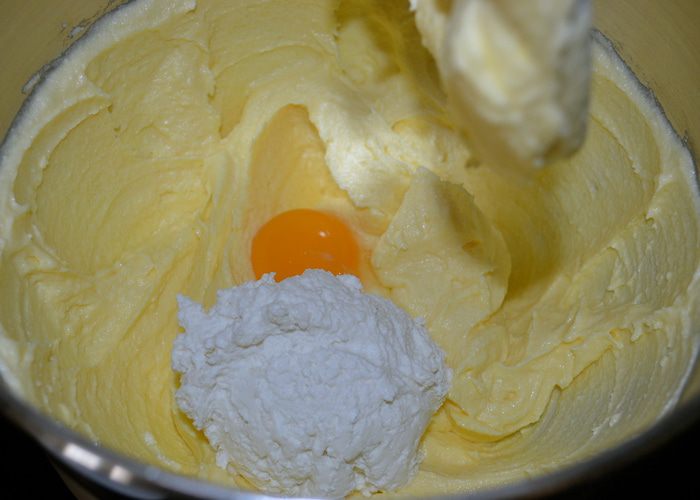 Добавить 1 яичный желток. Продолжая взбивать, дождаться, когда масса станет однородной и ввести 1 большую ложку творога. Таким образом, поочередно, не переставая взбивать массу на средней скорости миксера, добавить все желтки и творог.
