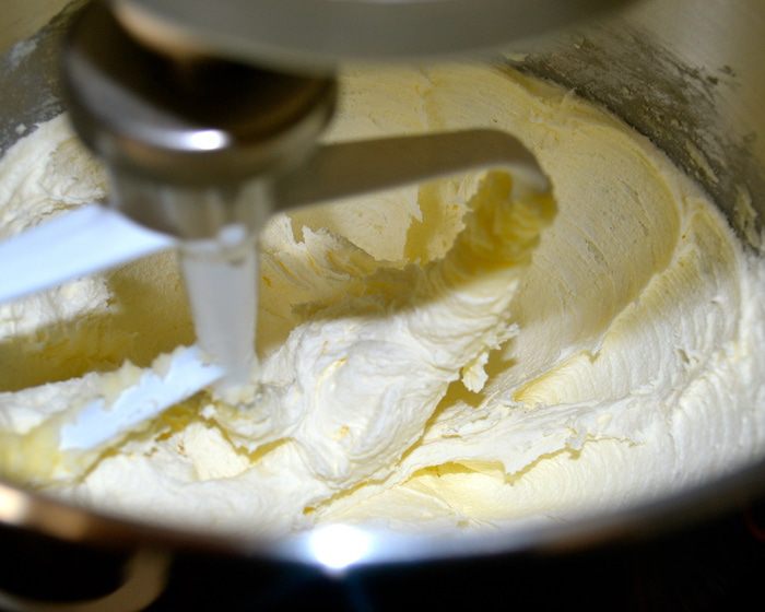 Затем в чаше кухонного комбайна взбить размягченное сливочное масло с 200 г сахарной пудры и ванильным сахаром до кремового состояния.