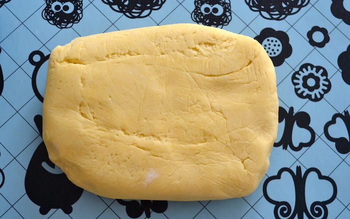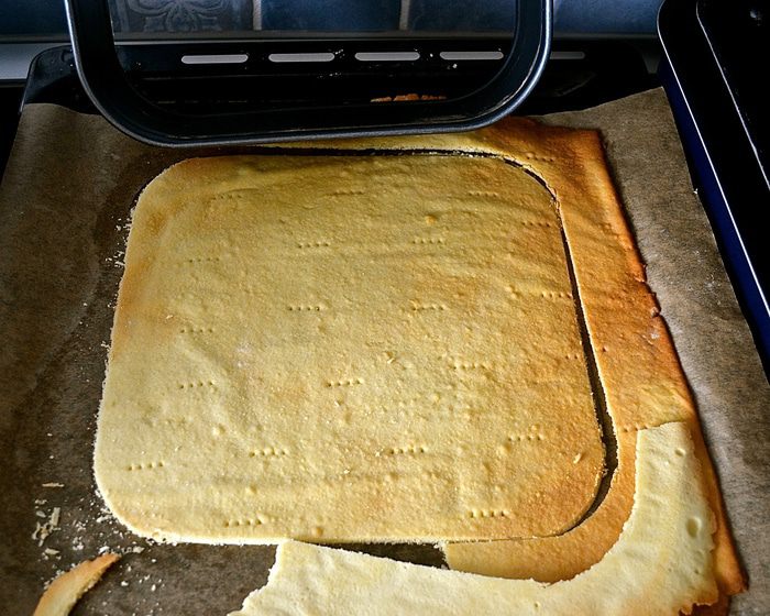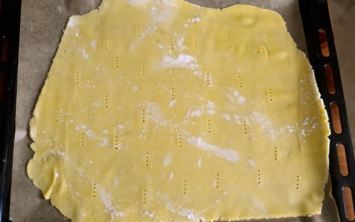 По истечение указанного времени взять две трети охлажденного теста и раскатать в пласт прямоугольной формы. Очень осторожно перенести раскатанное тесто на противень, застеленный пекарской бумагой. Наколоть поверхность вилкой и убрать в холодильник снова на 30 минут.