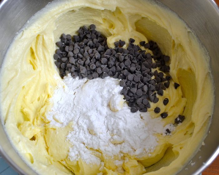 В творожную массу аккуратно добавить шоколадные капли и крахмал (в оригинале - вместо шоколада добавляется изюм...).